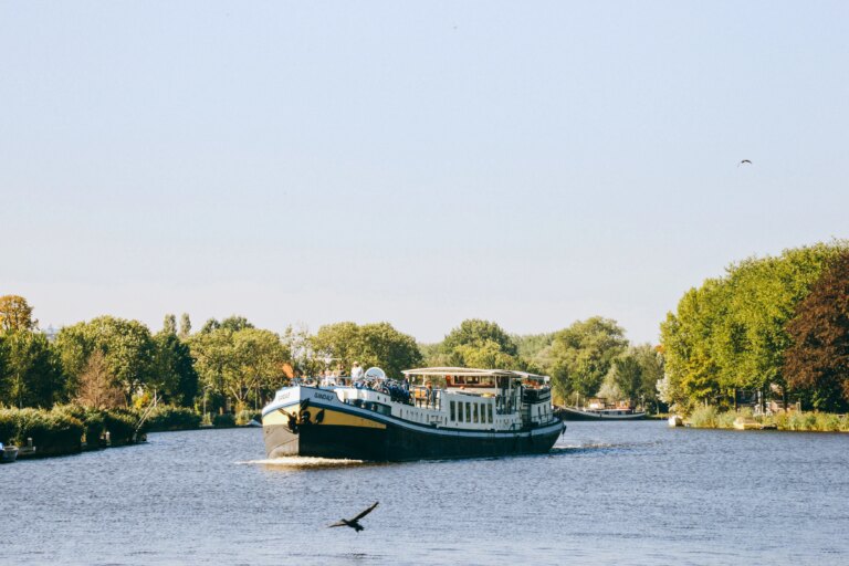 Kleines, gemütliches Flussschiff, das durch die niederländischen Kanäle fährt. An Deck befinden sich ein Restaurant, eine Bar und ein Entspannungsbereich.