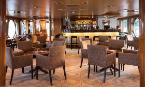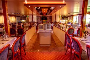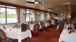 Komfortabel und gemütlich schippert die Olympia die Mosel entlang. Der Lounge- und Restaurantbereich im englischen Stil mit Panoramafenstern bietet den Gästen unvergessliche Momente der Entspannung.