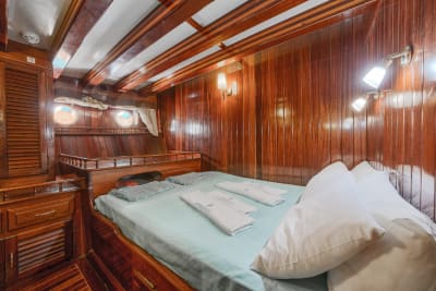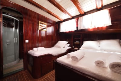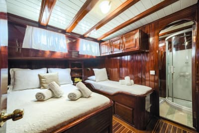 mehr lesenSie übernachten auf einer eleganten und komfortablen Motoryacht, die einem traditionellen türkischen Gulet nachempfunden ist. An Bord gibt es einen schönen Salon, ein großes Deck zum Sitzen und Sonnenbaden und ein Restaurant mit einer großen Auswahl an authentischen Gerichten, damit Sie das Beste der griechischen Küche genießen können. Die Kabinen sind geräumig und mit eigenem Bad und Klimaanlage ausgestattet.