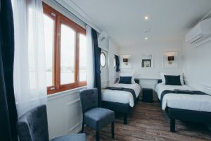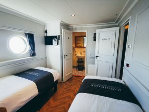 - 1 Doppelbettzimmer auf dem Unterdeck, ca. 10 m², mit zwei Einzelbetten und Fenstern, die nicht geöffnet werden können. Auf Anfrage kann es zu einem Doppelzimmer zur Einzelnutzung werden.