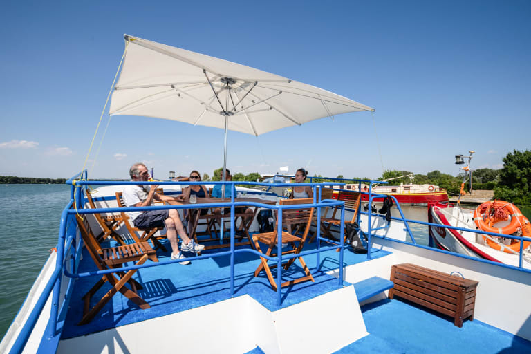 Das Sonnendeck mit Tischen und Stühlen ist der perfekte Ort, um die Schifffahrt zu genießen und sich mit Ihren neuen Reisegefährten zu unterhalten.